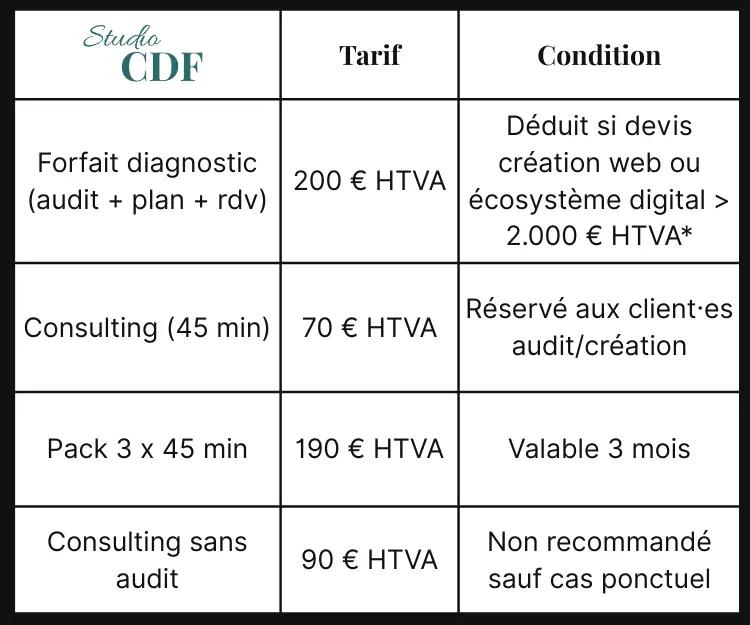 Ce tarif s’applique uniquement si tu choisis d’entrer directement en consulting, sans forfait diagnostic.